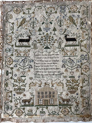 Our inspiration begins with the 1834 sampler created by Eliza Burgess. Each of us will be designing a project rooted in her beautiful work.